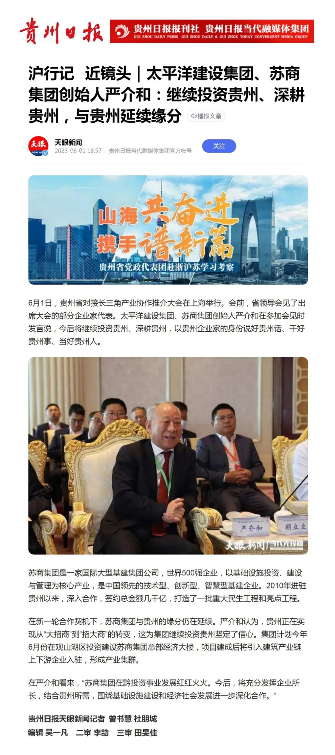 資訊:6月1日,貴州省對接長三角產(chǎn)業(yè)協(xié)作推介大會在上海舉行。會前,省領導會見了出席大會的部分企業(yè)家代表。太平洋建設集團、蘇商集團創(chuàng)始人嚴介和在參加會見時發(fā)言說,今后將繼續(xù)投資貴州、深耕貴州,以貴州企業(yè)家的身份說好貴州話、干好貴州事、當好貴州人。